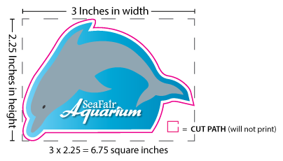 Pricing is based on size. If you draw an imaginary rectangle around your shape, that would be the width & height of your product. The entire decal (including the vector cut path) must fit within this rectangle.