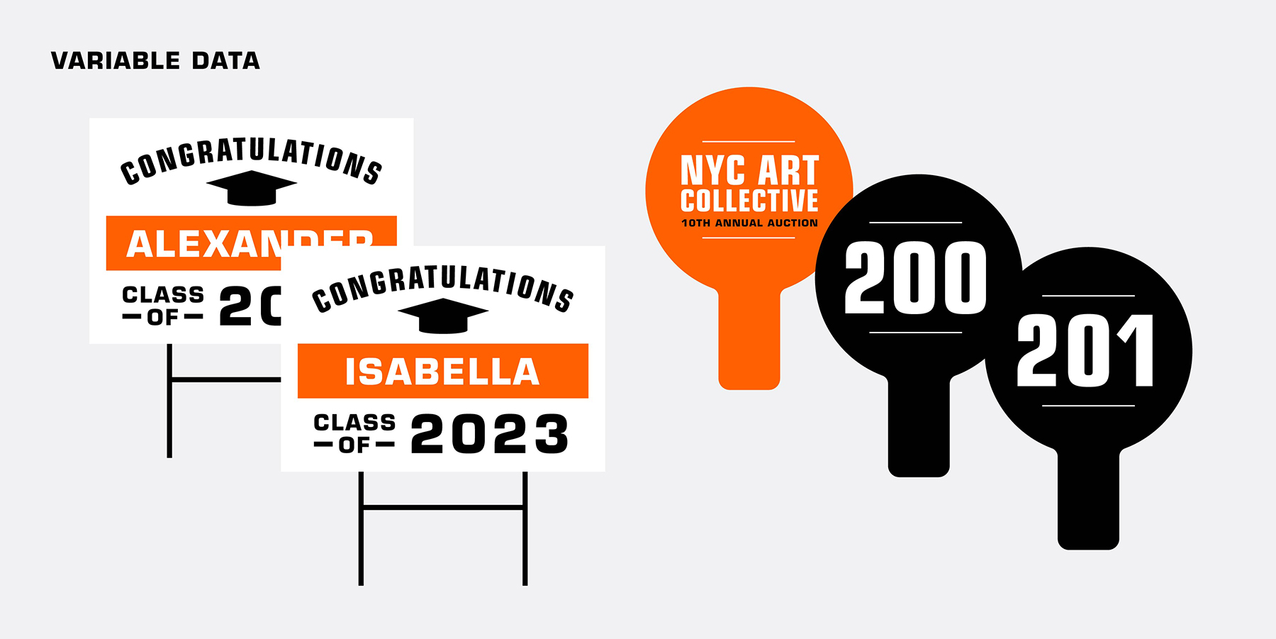 Example: Auction paddles that have the same artwork, but each have a different number. We can do consecutive or custom numbering