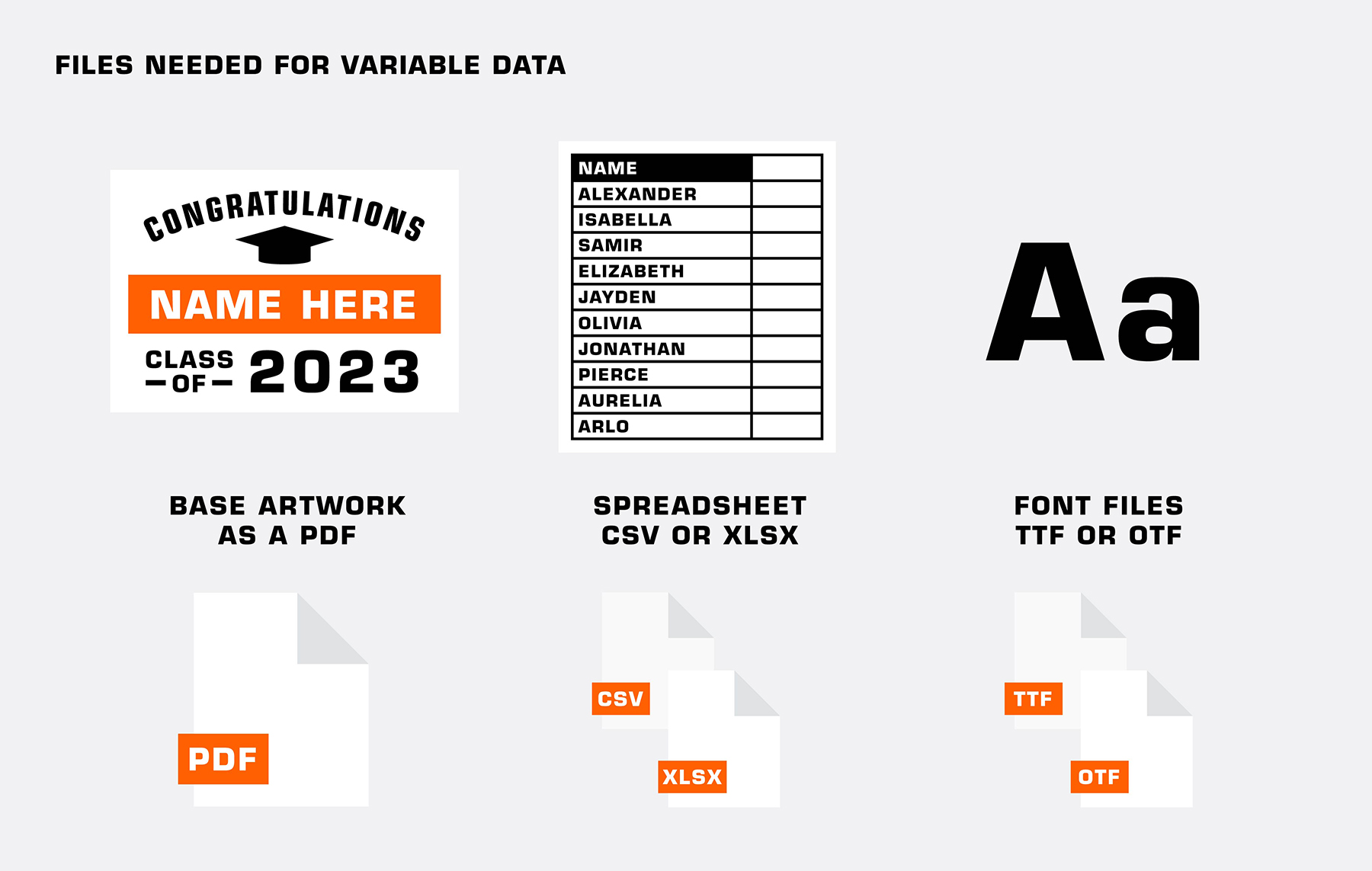 Variable data is for digitally printed products that require different text for each item. All variable data orders with custom text will require a spreadsheet.